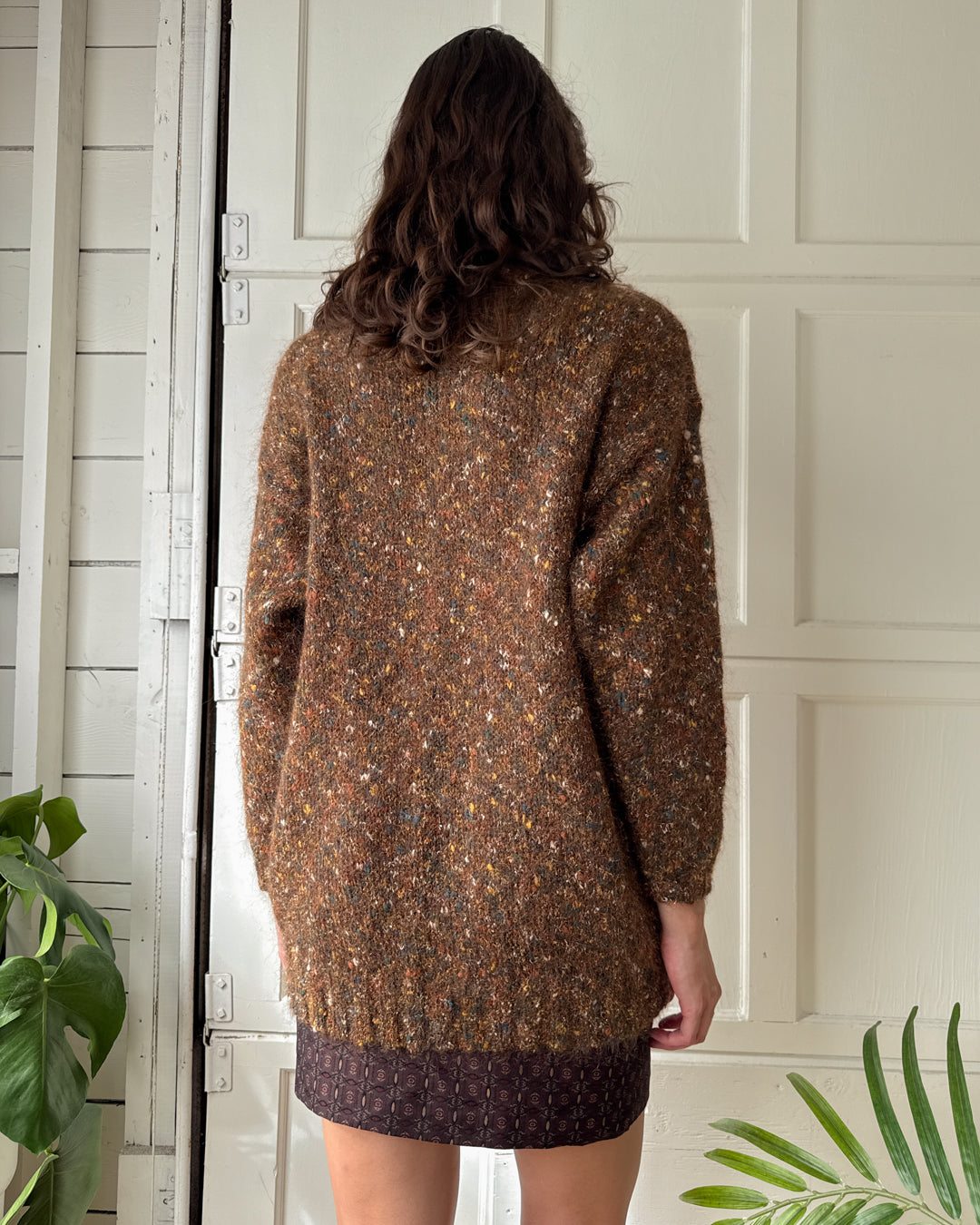 Vintage 1990s brown mohair blend turtleneck sweater with gold metallic thread and colorful flecks.