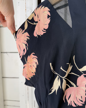 Vintage 1940s navy blue & pink floral print cold rayon peplum top & skirt dress set.