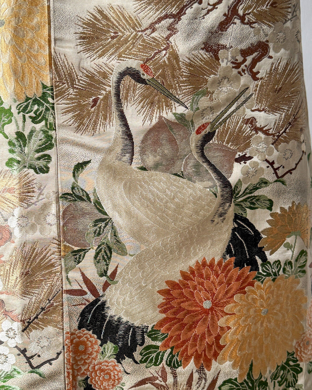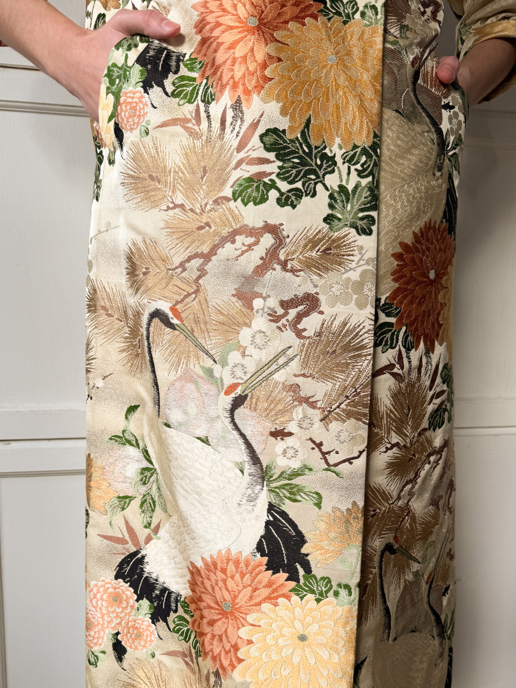 Vintage 1960s silk brocade evening coat with a cranes and chrysanthemums motif.
