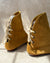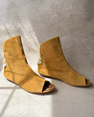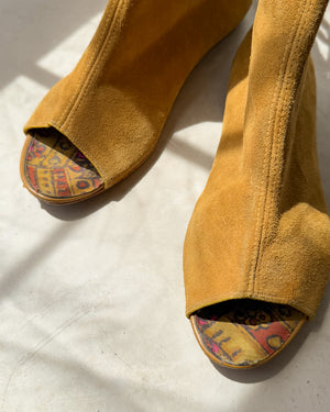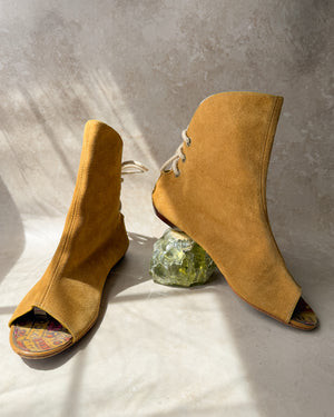 Vintage 1960s tan suede open toe booties with low stacked wooden heels. Lace up backs. Colorful psychedelic insoles. Unlined.