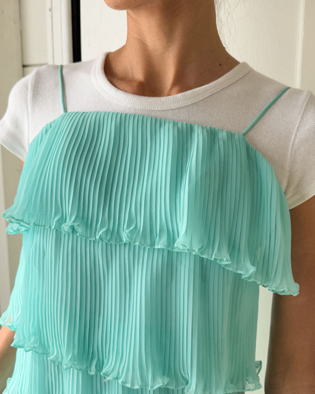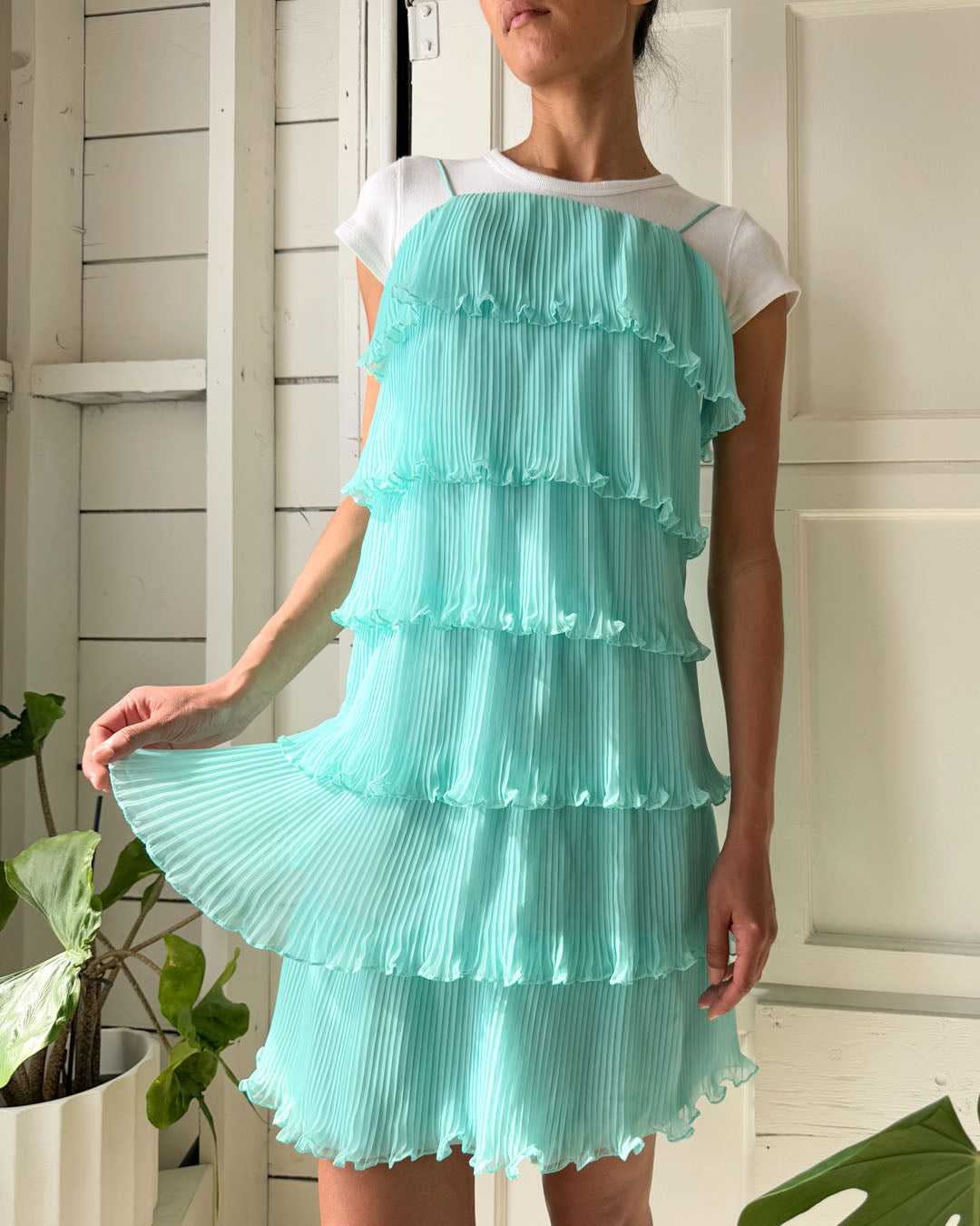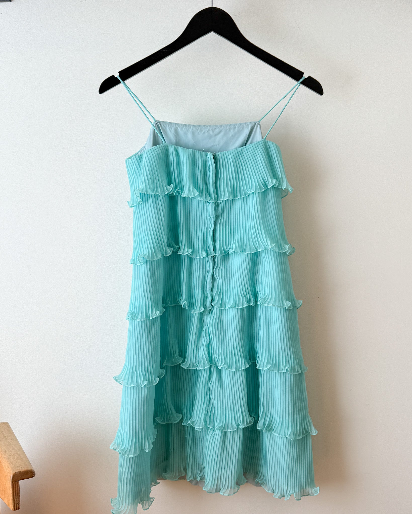 Vintage 1970s light aqua tiered ruffle mini dress.