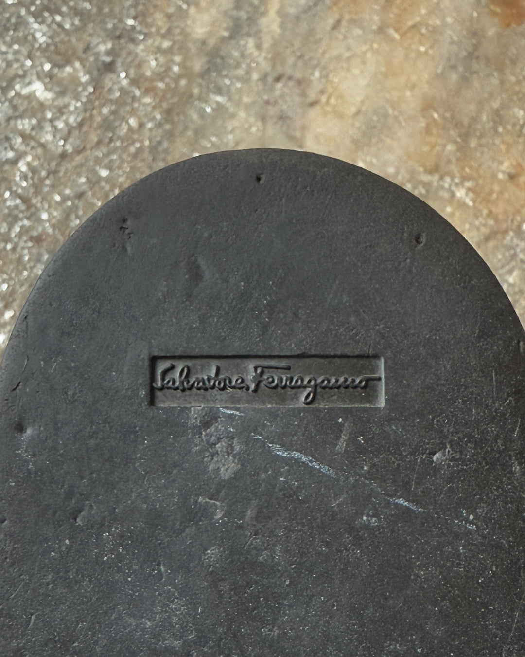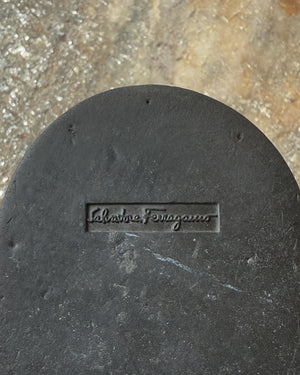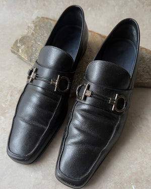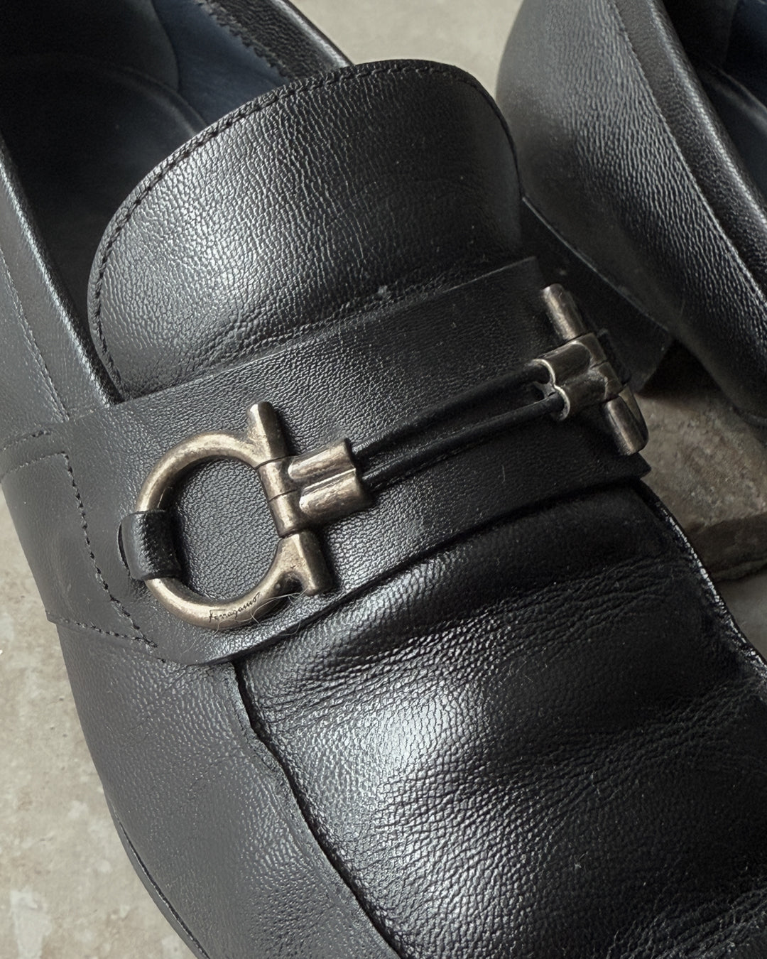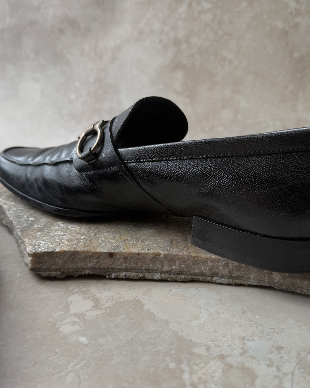 Vintage men's Salvatore Ferragamo black leather slip-on loafers with horsebit details. All leather construction with leather lining. Made in Italy