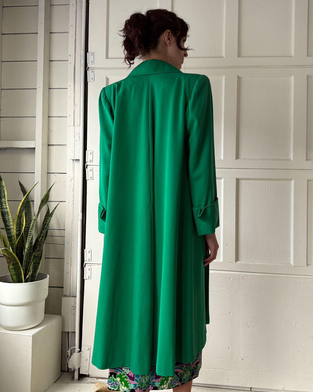Vintage 1940s spearmint green gabardine swing coat with dramatic pointed collar.