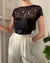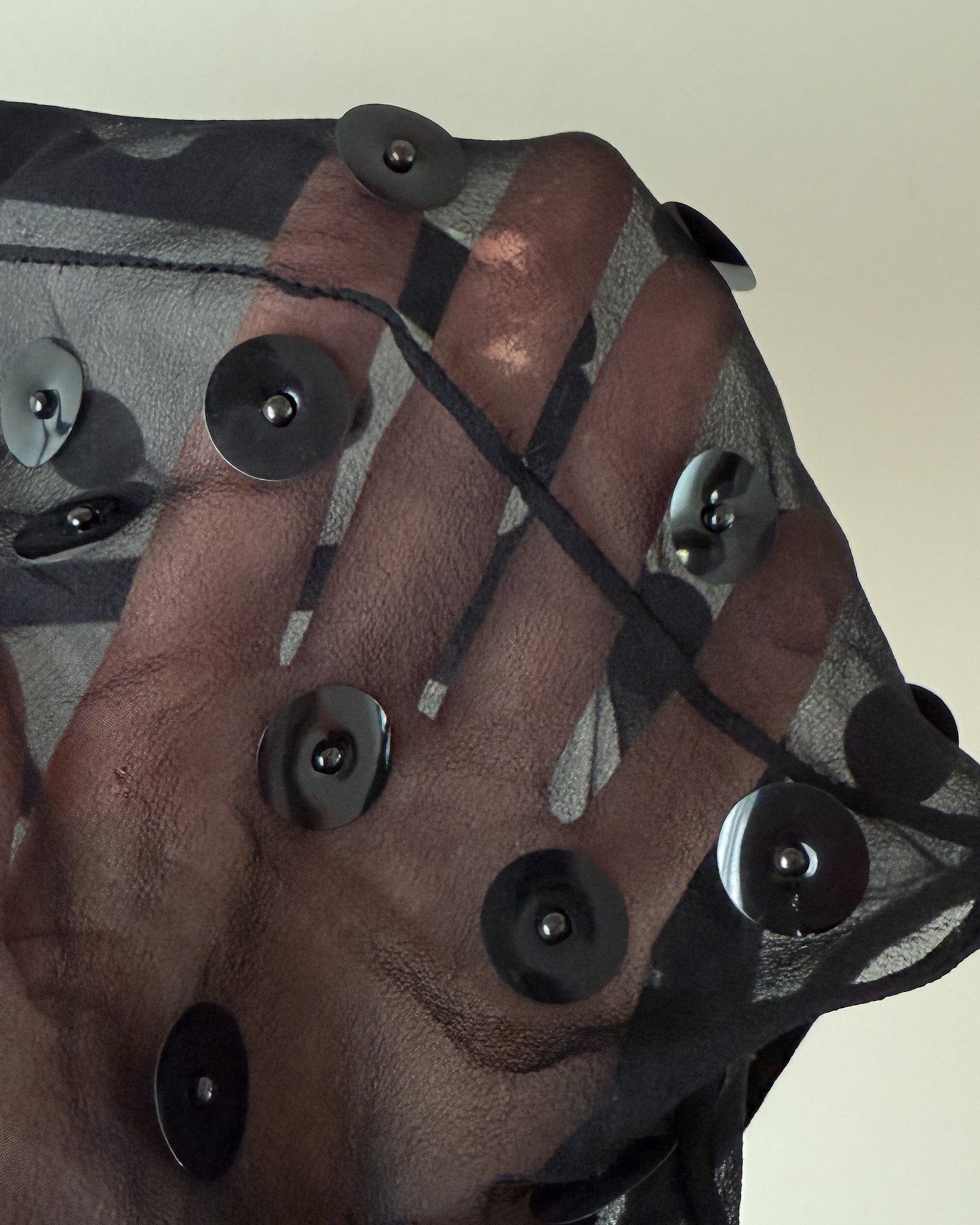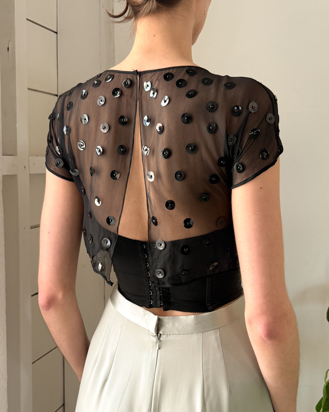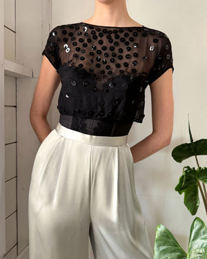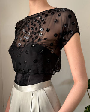 Vintage 1940s sheer black silk cropped top with shiny round paillette sequins.