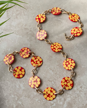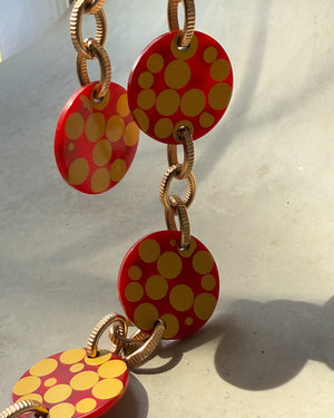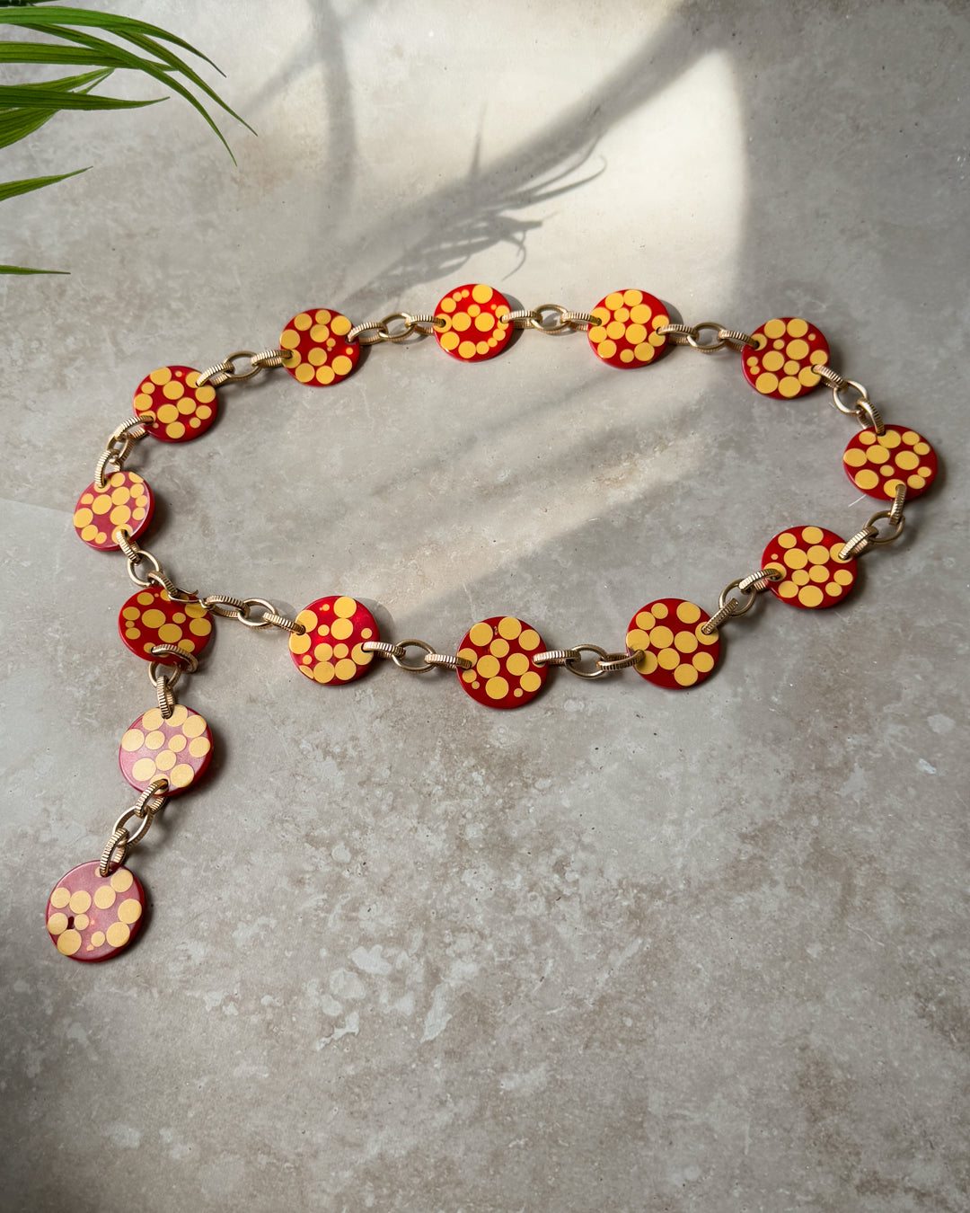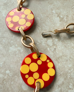 Vintage 1960s gold tone metal chain belt with round injected dot bakelite discs. Red bakelite with round yellow dot inclusions. Hook closure. Possibly unsigned Charles Elkhaim.