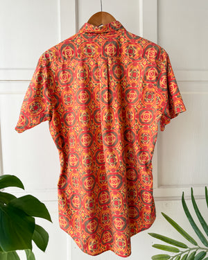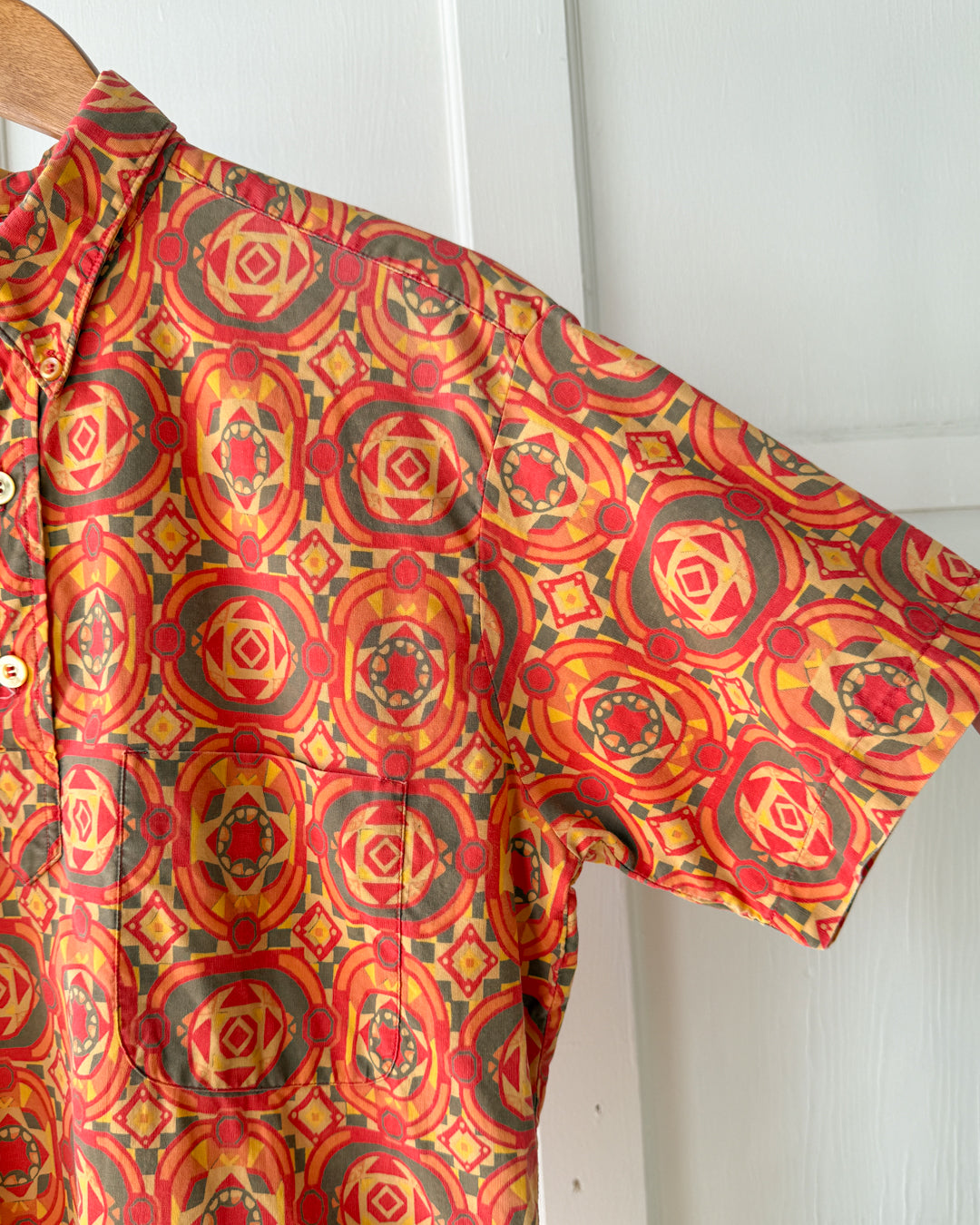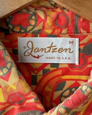 Vintage 1960s Jantzen colorful printed cotton quarter button down pullover shirt.