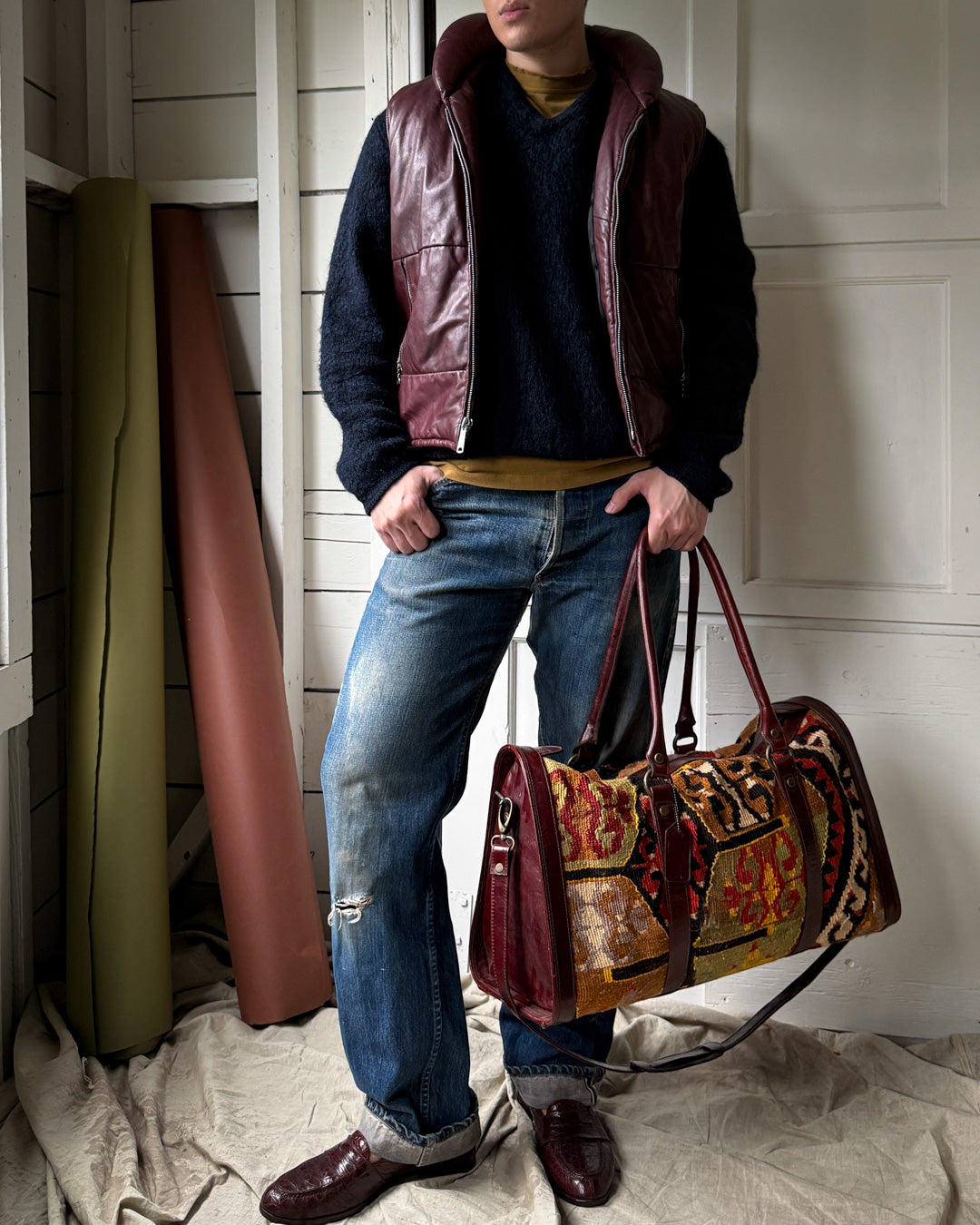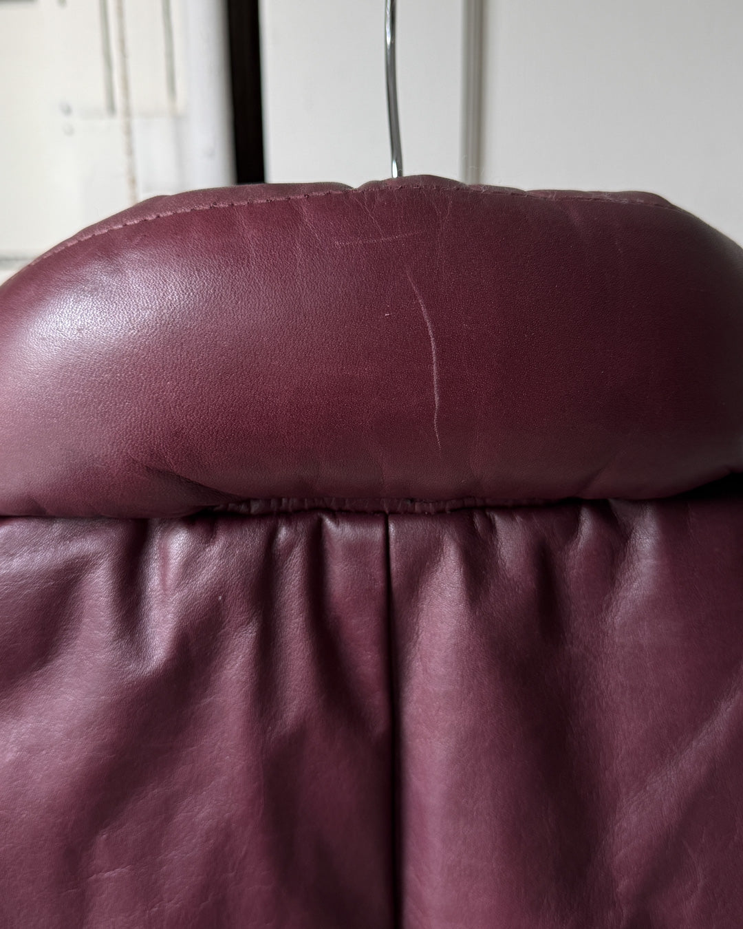 Vintage 1980s men's burgundy leather vest with unique padded round collar.