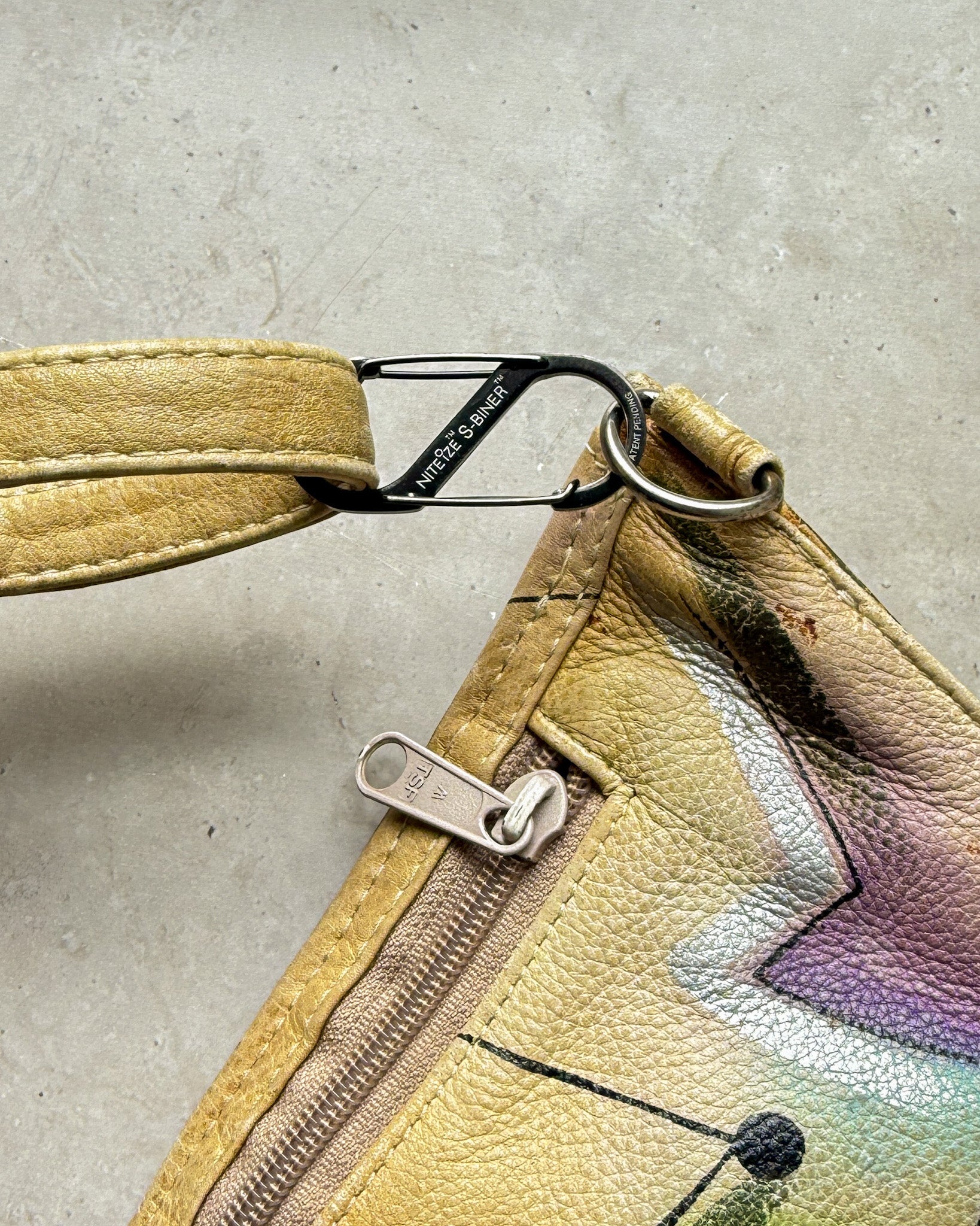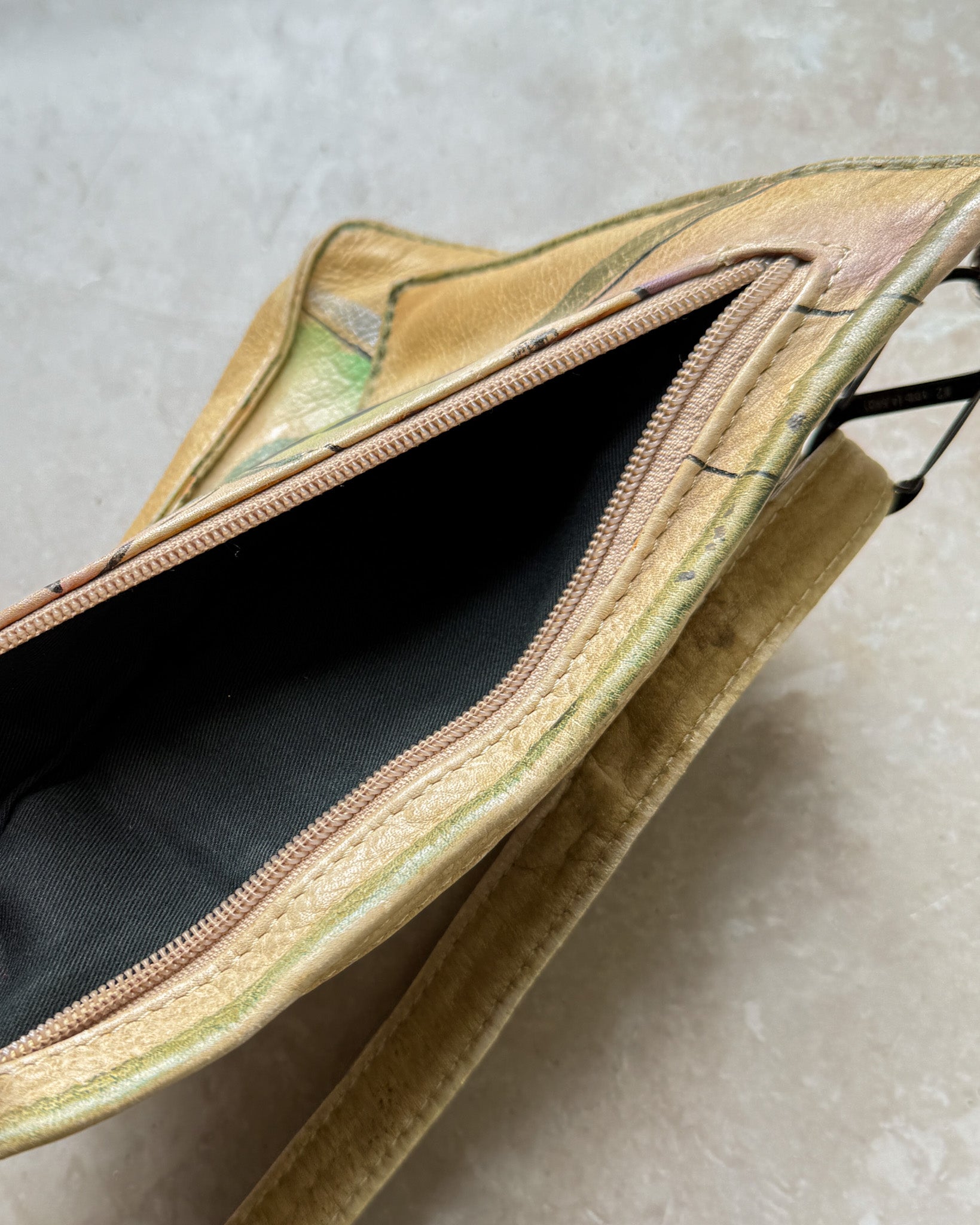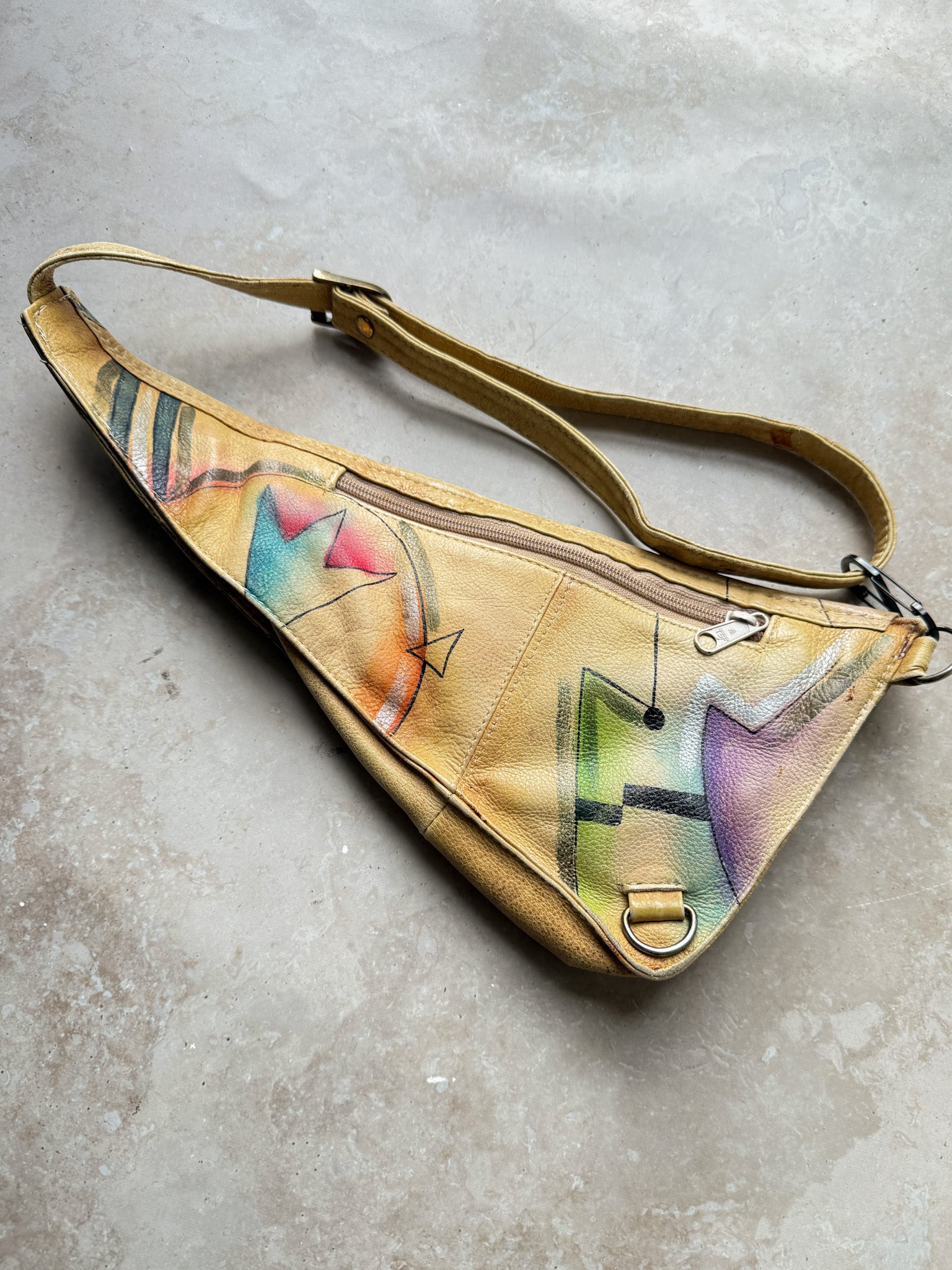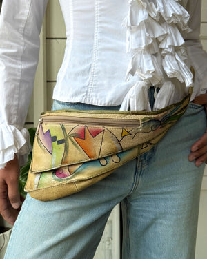 Vintage 1980s triangular hand painted leather hip or sling bag, fanny pack.