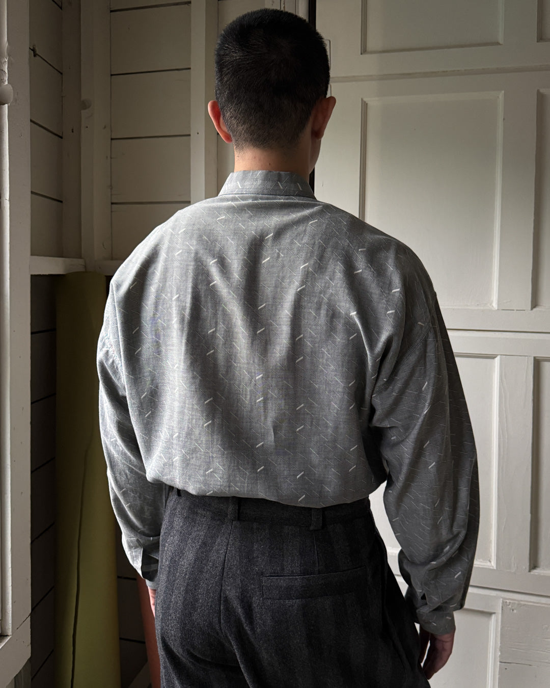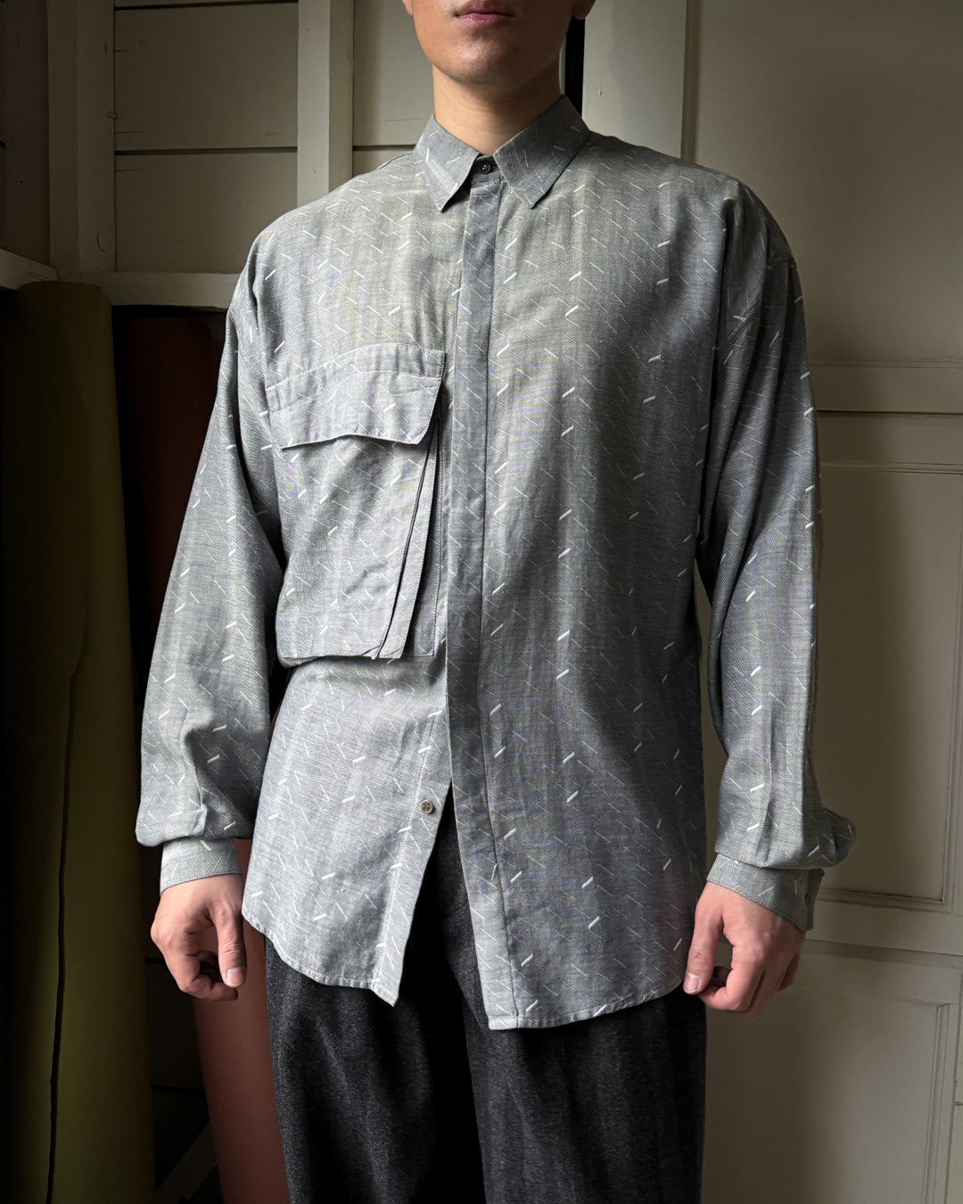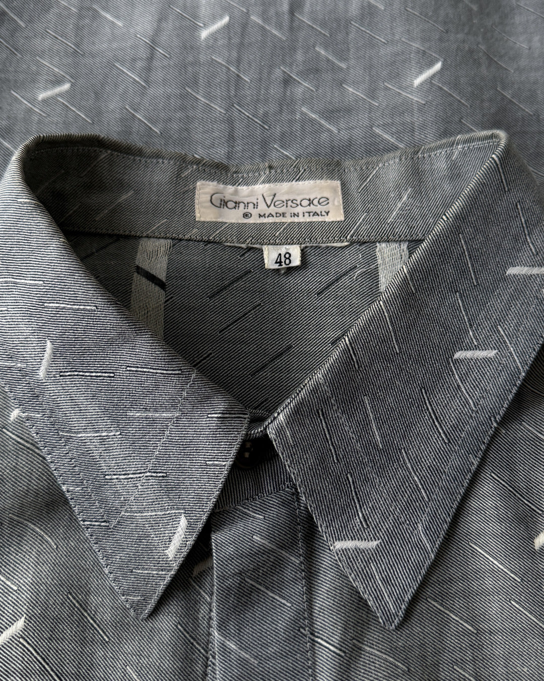 Vintage 1980s Gianni Versace men's woven gray cotton long sleeve shirt with large unique front pocket.
