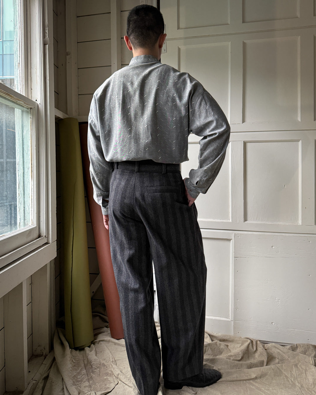 Vintage 1980s Versace men's two tone charcoal gray wool trousers with abundant waist pleats.