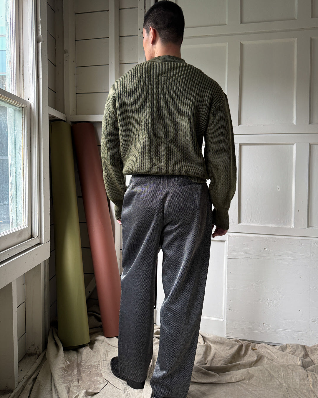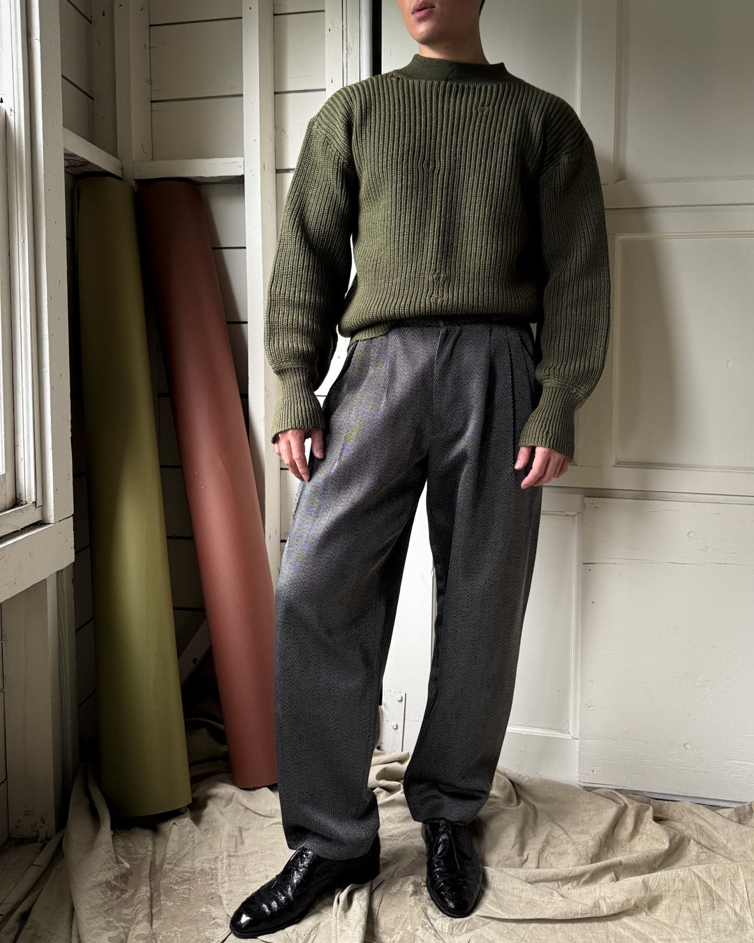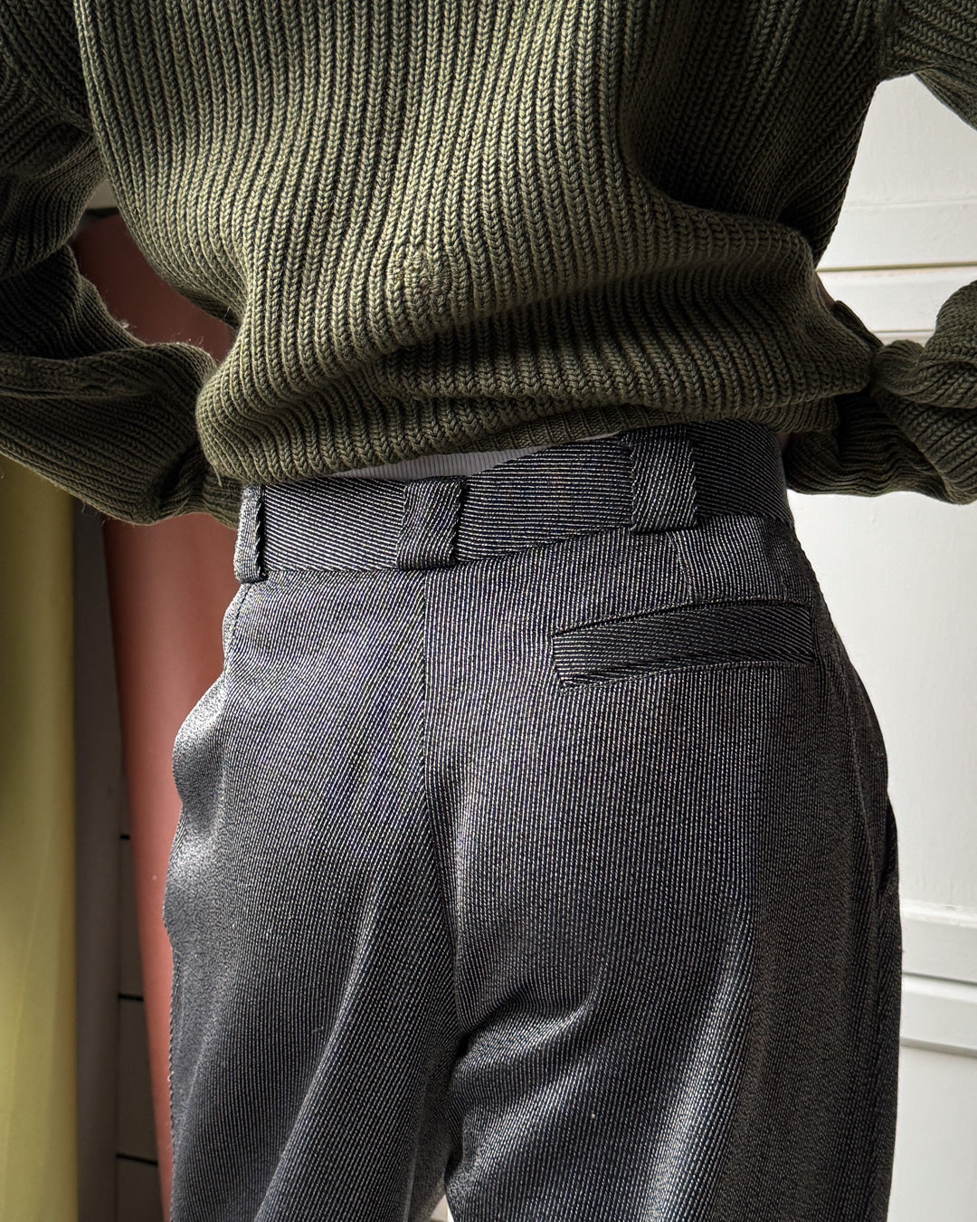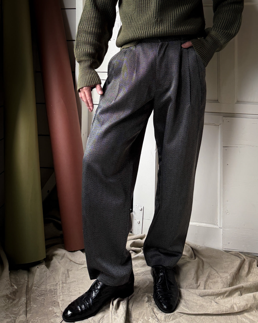 Vintage 1980s Versace men's textured black silky wool blend pants with tiny white woven stripes.