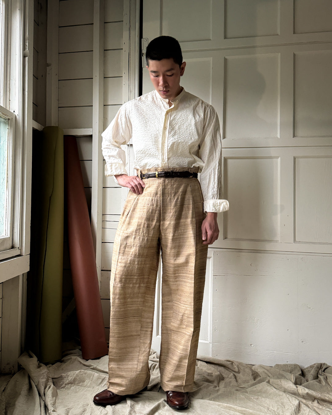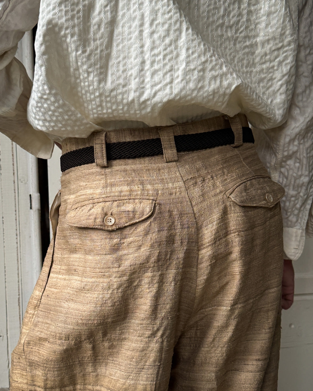 Vintage 1980s men's woven natural raw silk trousers with pleats.