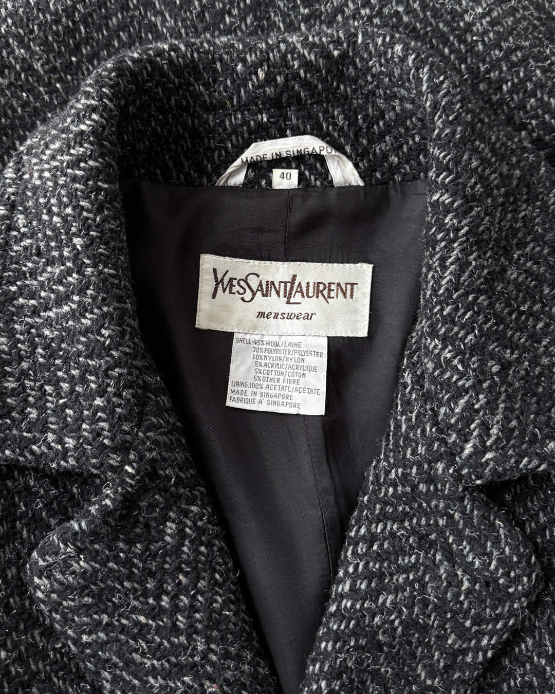 Vintage 1990s Yves Saint Laurent men's black & gray woven tweed overcoat.