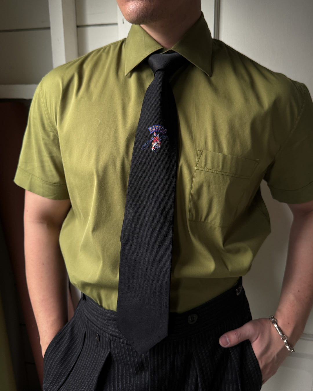 Vintage 1990s Ferre 100% silk necktie. Black background with "Tattoo" and "Golden State" with a rose woven into the fabric.