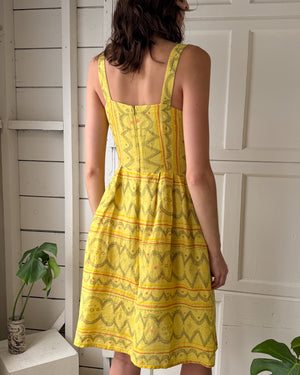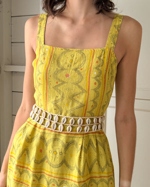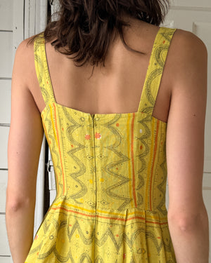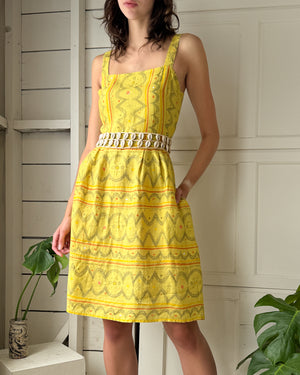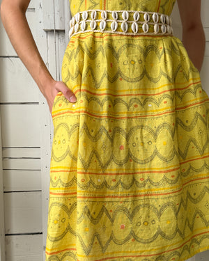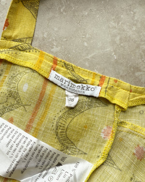 Vintage 1990s Marimekko printed yellow linen dress with pockets.