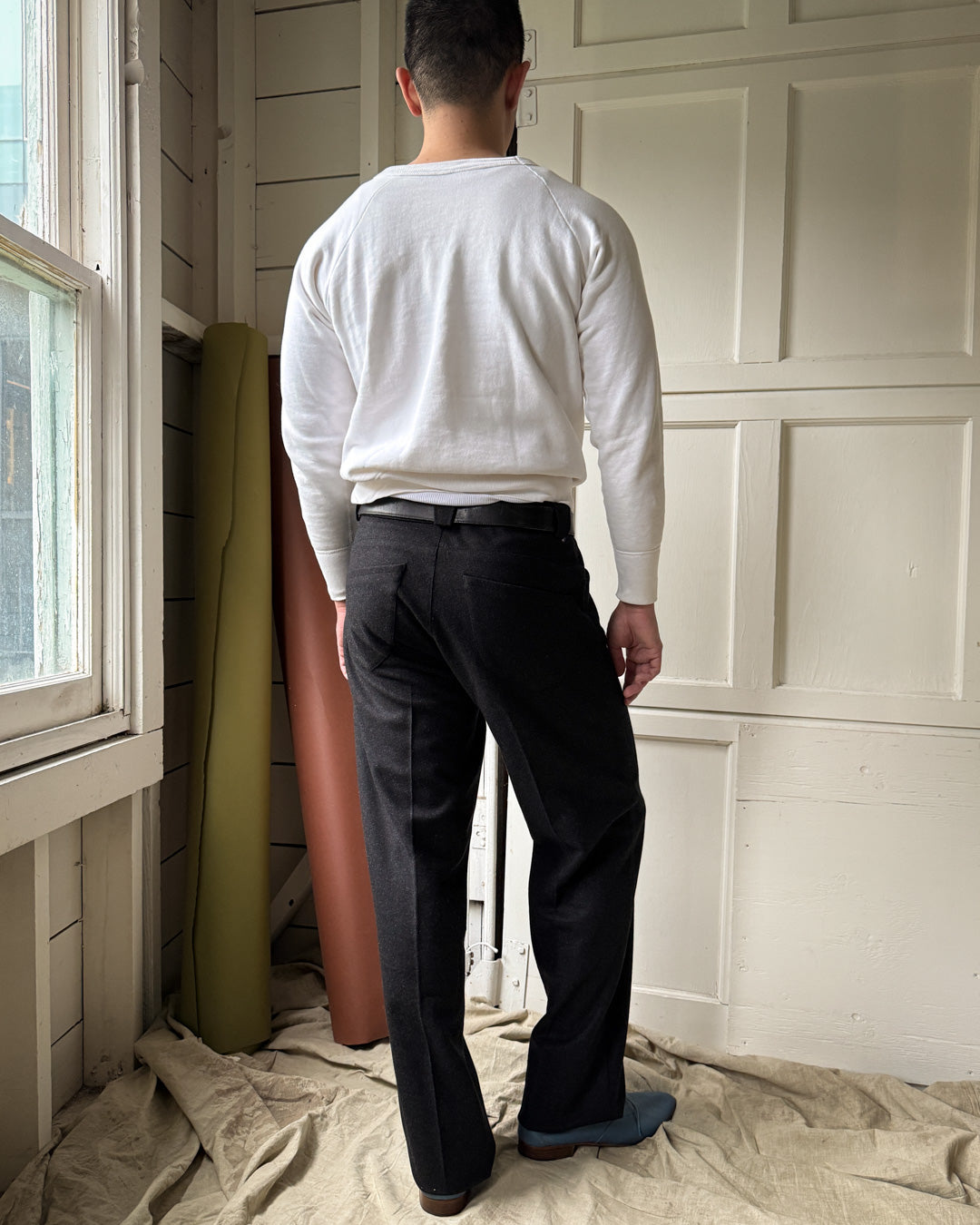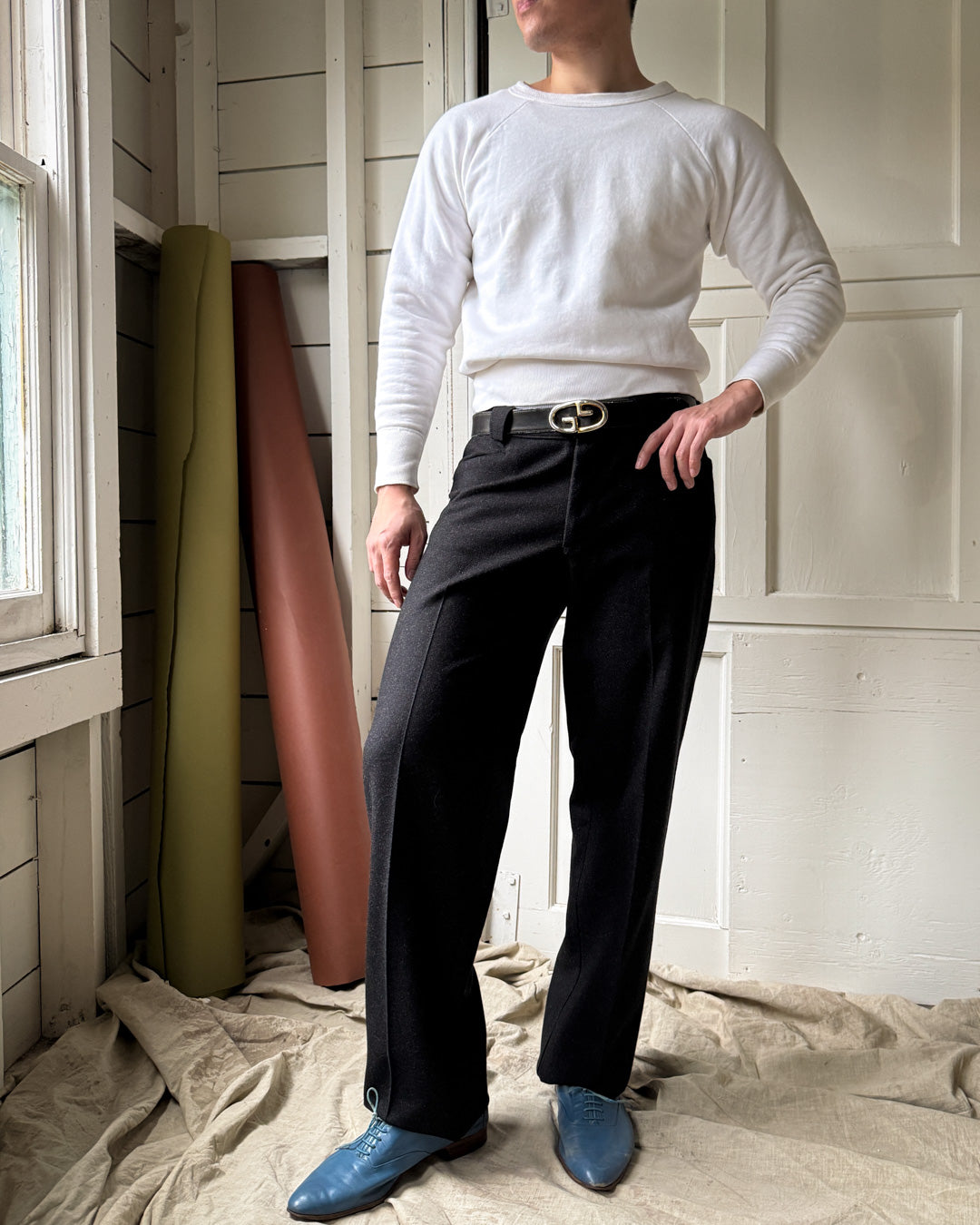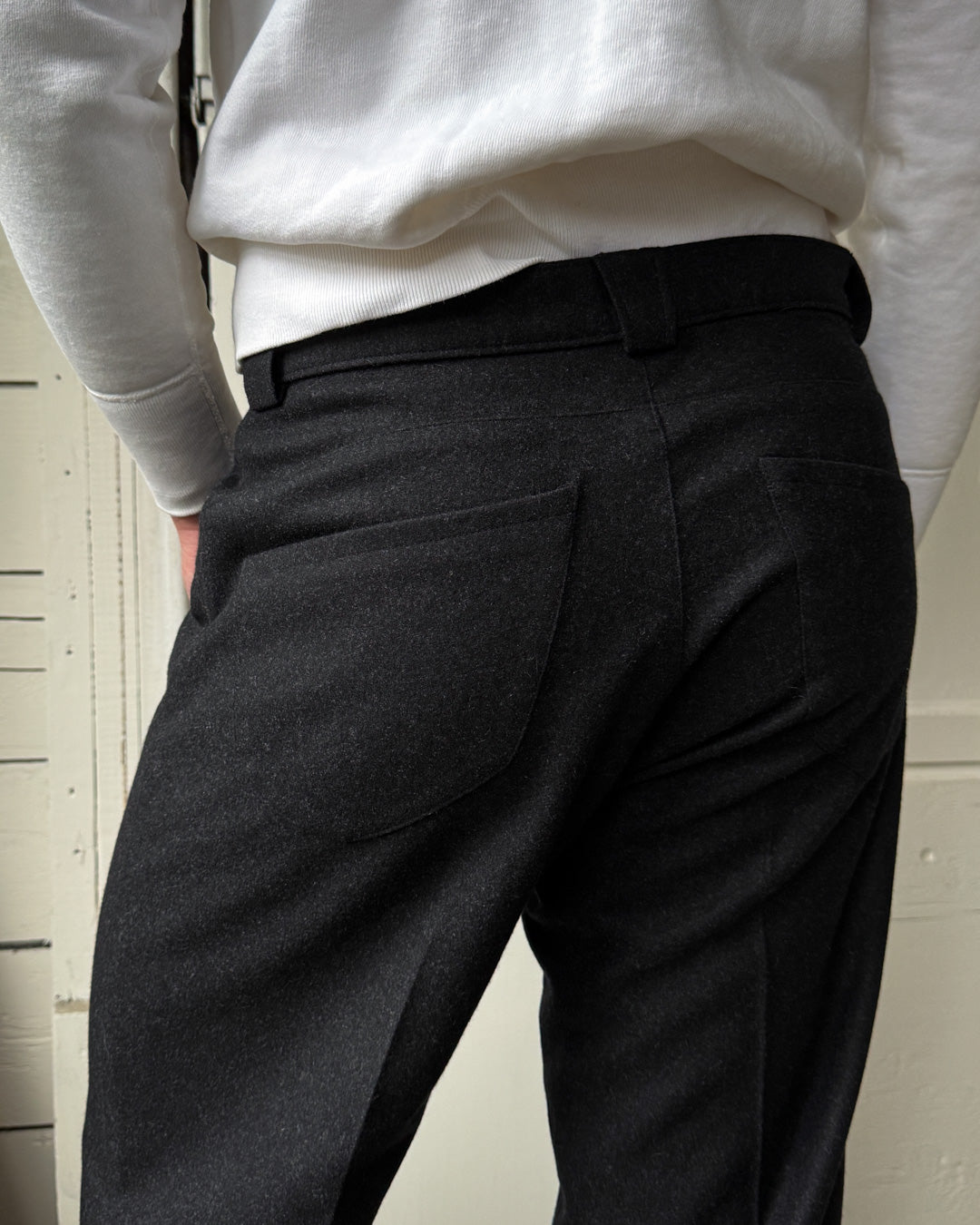 Vintage 1990s Mugler charcoal black speckled wool trousers with wide belt loops, slanted pockets and straight pintuck pleat leg detail.