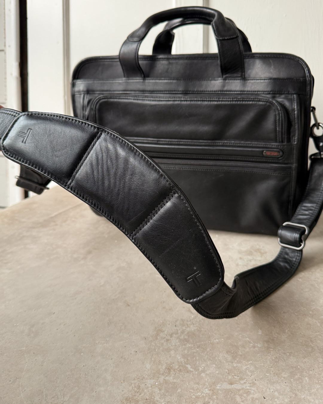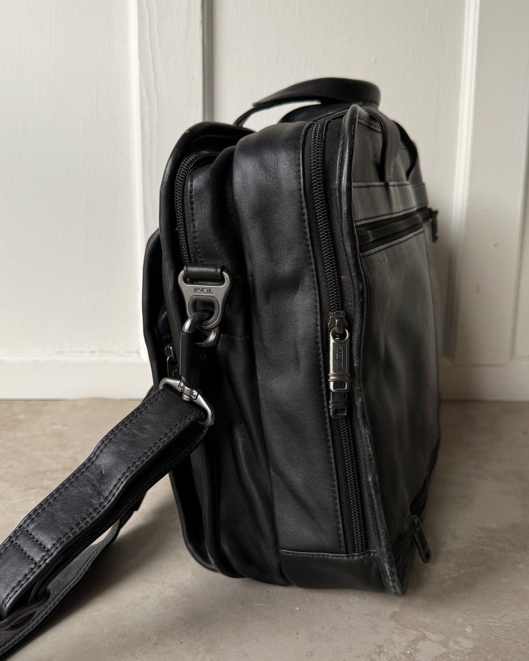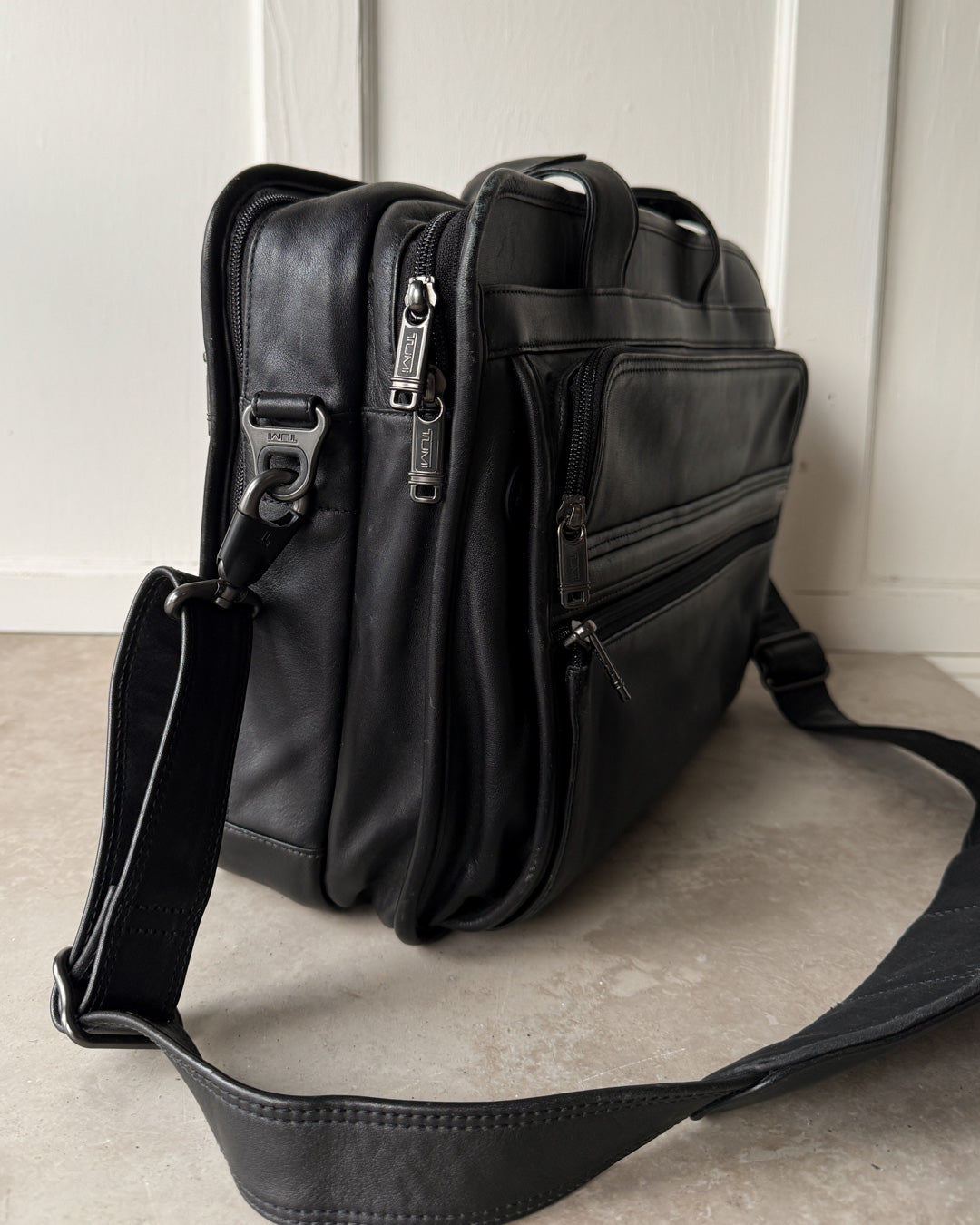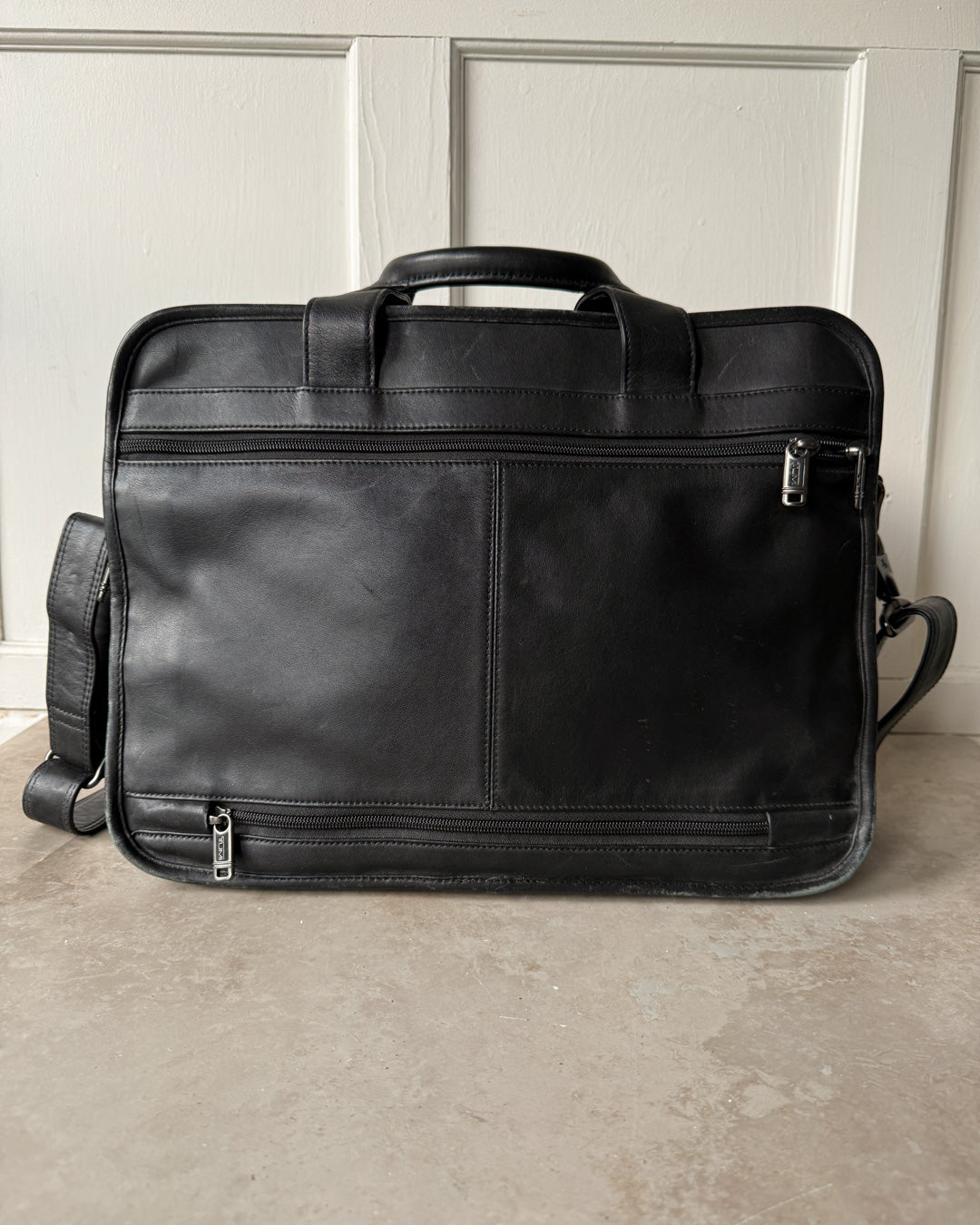 Vintage black leather briefcase bag with shoulder strap and lots of pockets.